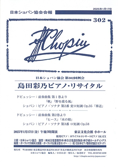日本ショパン協会第302回例会 島田彩乃ピアノリサイタル